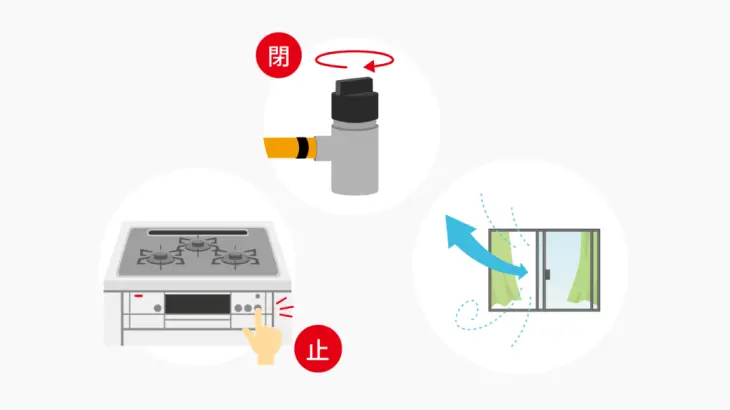 身の安全を確保し、揺れが収まってから使用中のガス機器を止めて、ガスの元栓も閉めてください。ガス臭いと思ったら、火器類や電気機器の使用をやめて窓を開け換気を行いましょう。