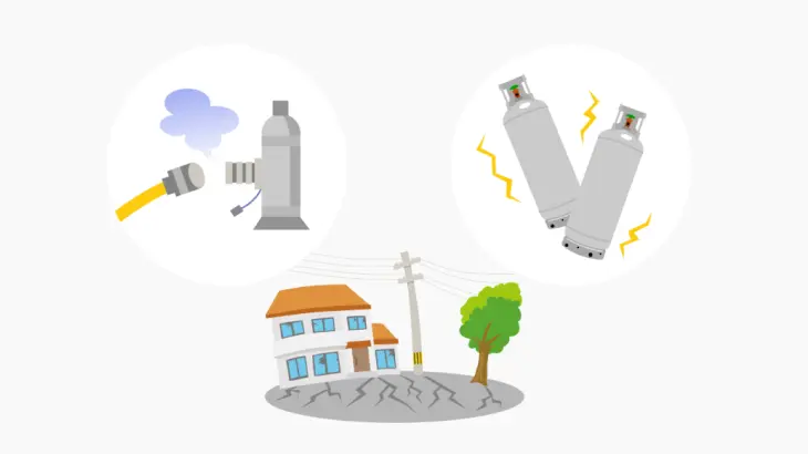 プロパンガス(LPガス)のボンベが倒れたりガス管が外れたりしていないか、給湯器等の給排気筒の外れがないか確認しましょう。機器類に不具合が生じていたり不安を感じる場合は点検を受けるまで使用を中止してください。